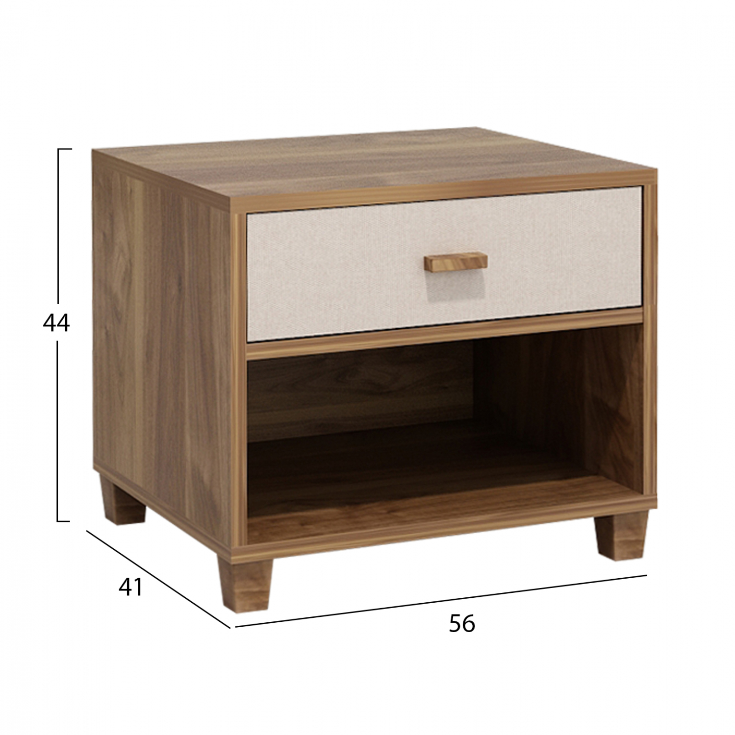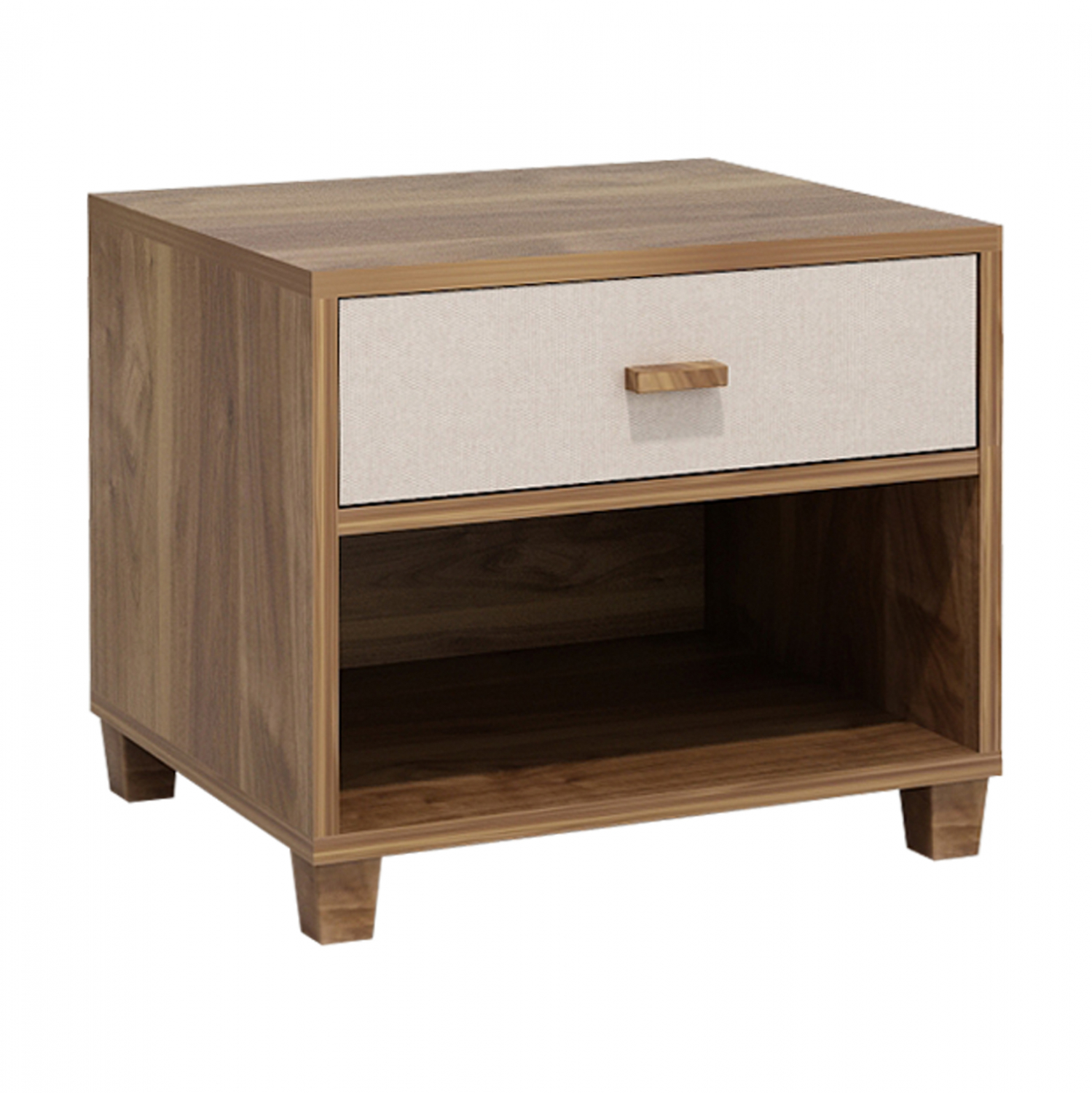 Κομοδίνο μελαμίνης με ένα συρτάρι από την σειρά “KOTON”, σε καρυδί απόχρωση με εκρού λεπτομέρειες.