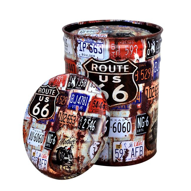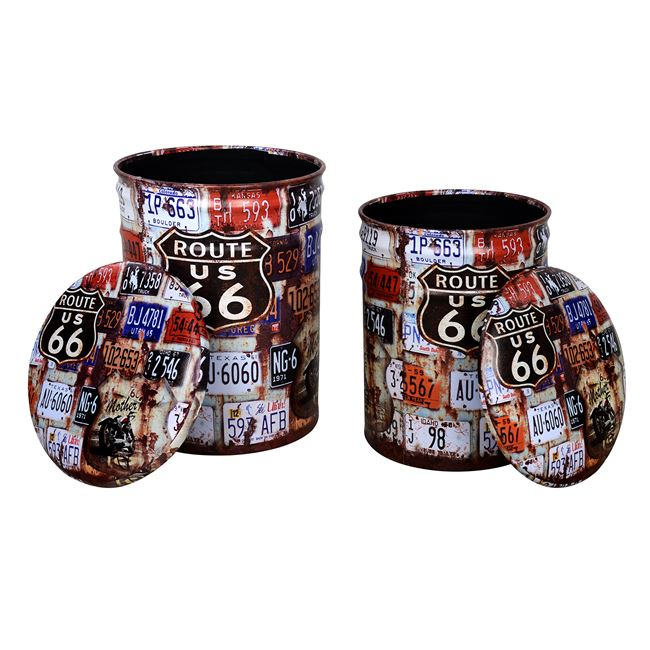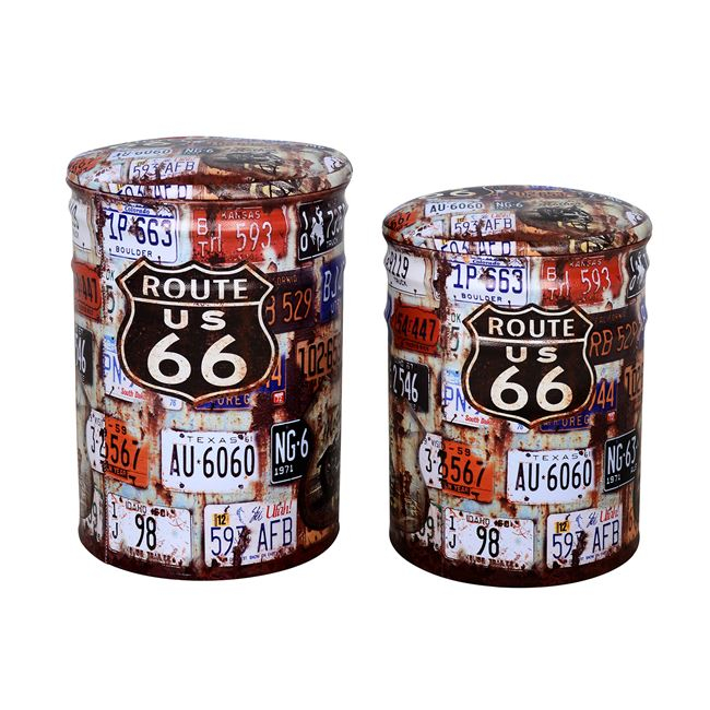 Σετ σκαμπώ 2 τεχαχίων με αποθηκευτικό χώρο κατασκευασμένο από μέταλλο και επενδυμένο με τεχνόδερμα με σχέδιο Rute 66.