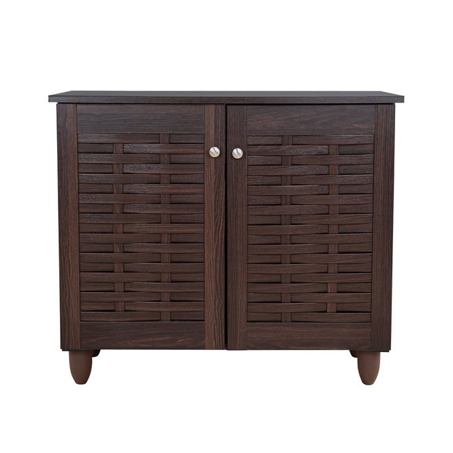 The shoe rack has 2 shelves, 3 levels of storage and recessed doors to ventilate your shoes.