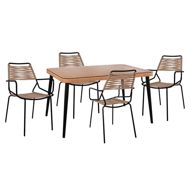 Four armchairs made of metal frame in black color and covered with knitted wide cord in beige color.