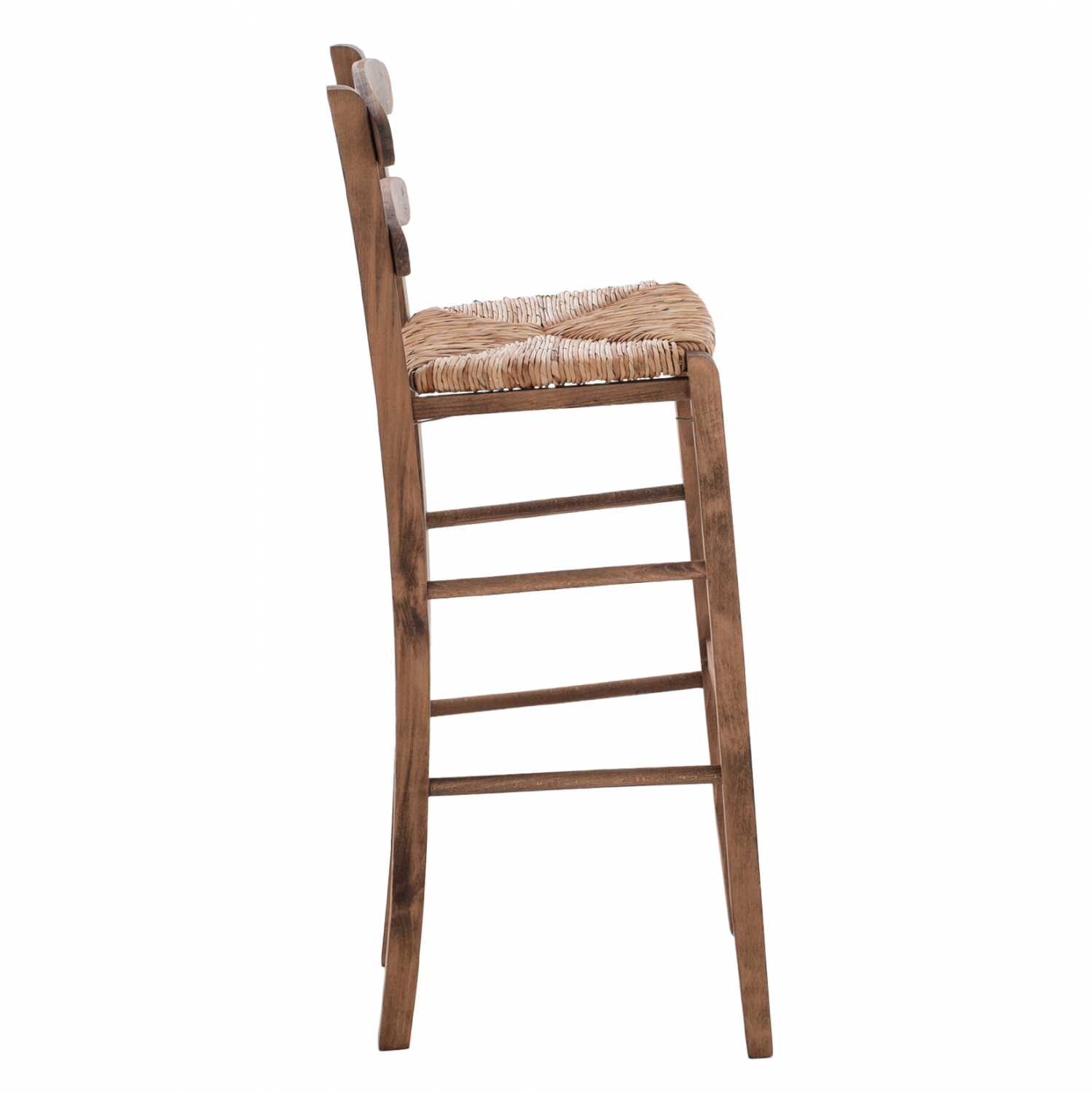 Coffee stool nailed from solid beech veneer wood impregnated with walnut and wicker.