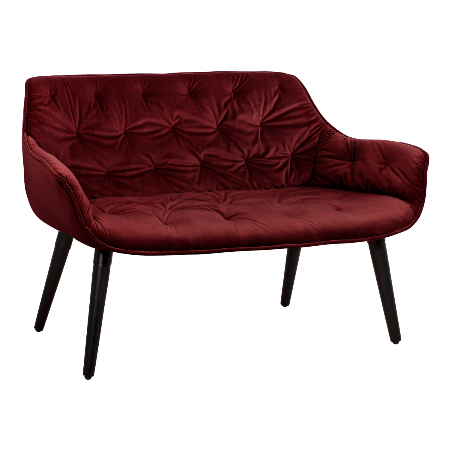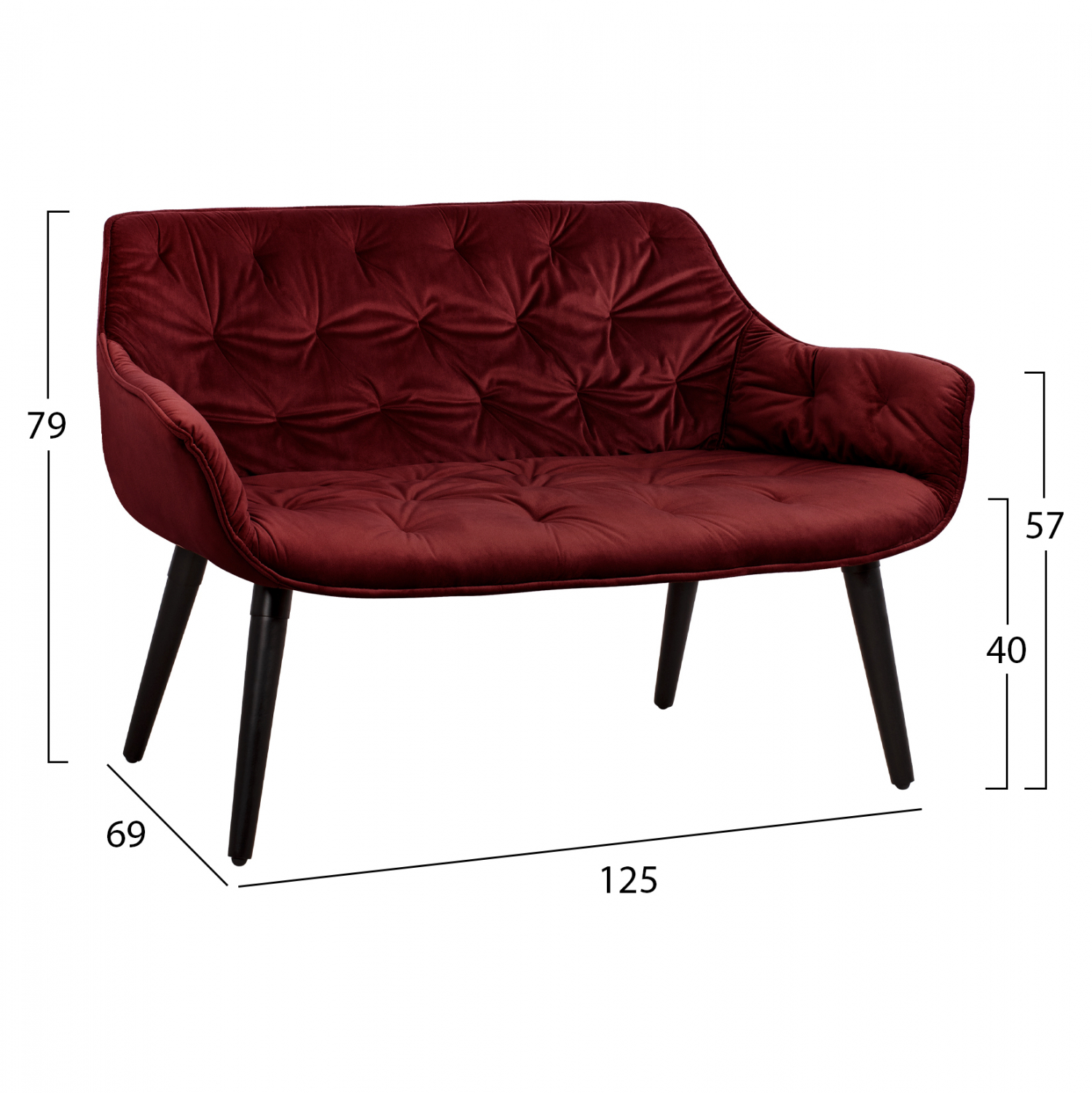 Διθέσιος καναπές Bethany με ύφασμα βελούδο σε απόχρωση κόκκινο Βουργουνδίας με ξύλινα πόδια σε μαύρη απόχρωση.