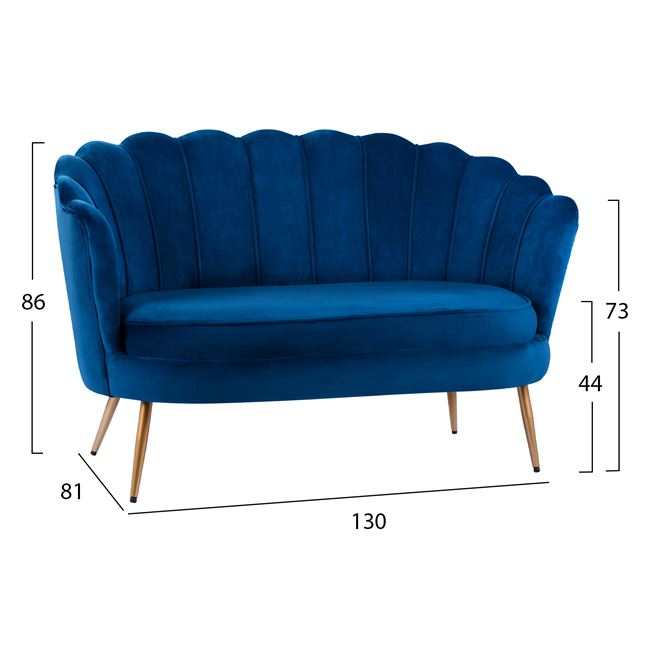 Καναπές διθέσιος COQUILLE από βελούδο σε μπλε απόχρωση με μεταλλικά πόδια σε χρυσή απόχρωση.