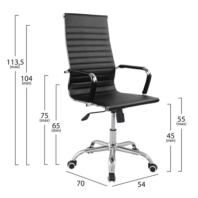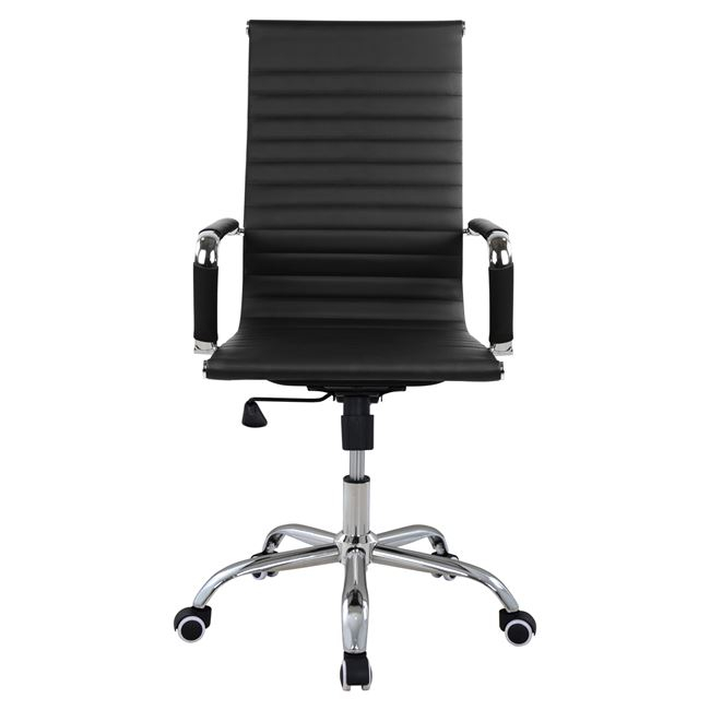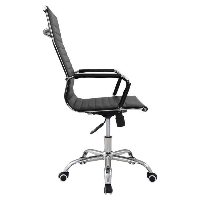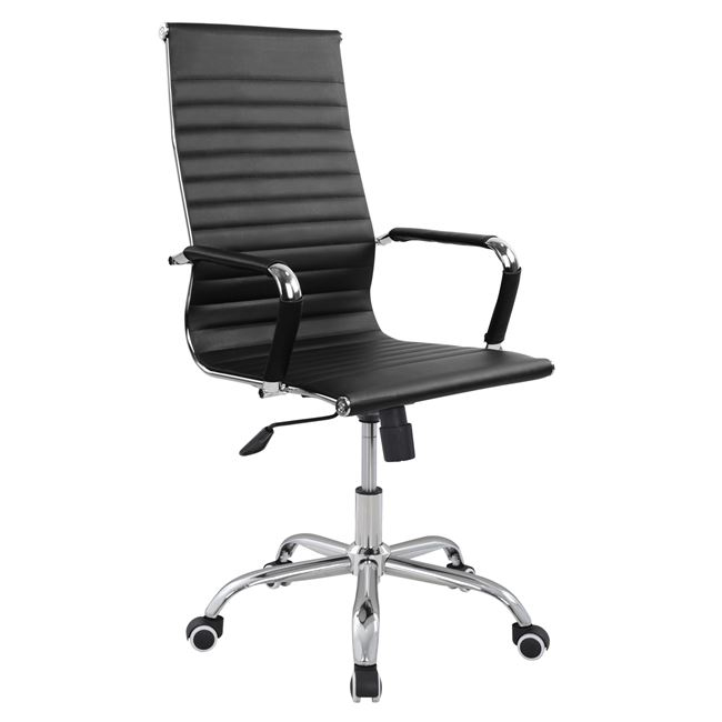 Καρέκλα γραφείου σε μαύρη απόχρωση με επένδυση από δερματίνη και πόδι χρωμίου.