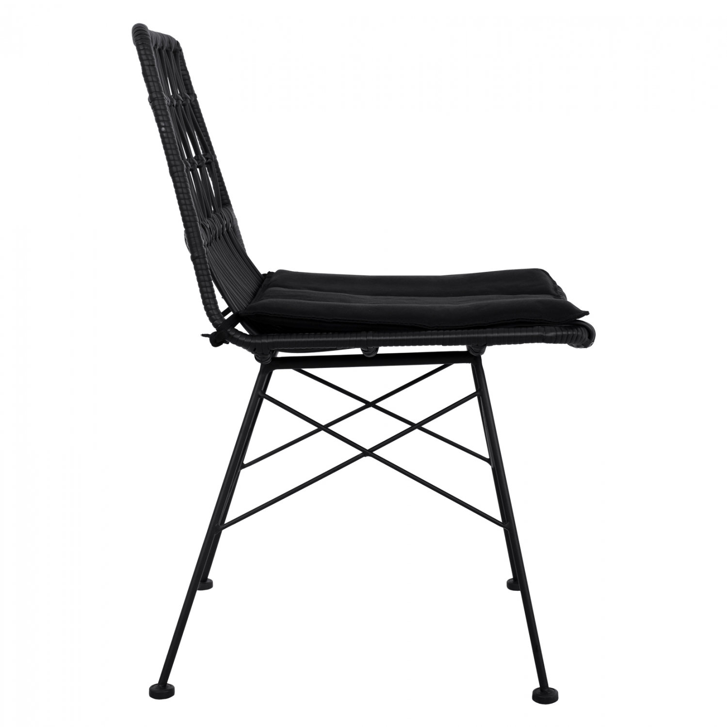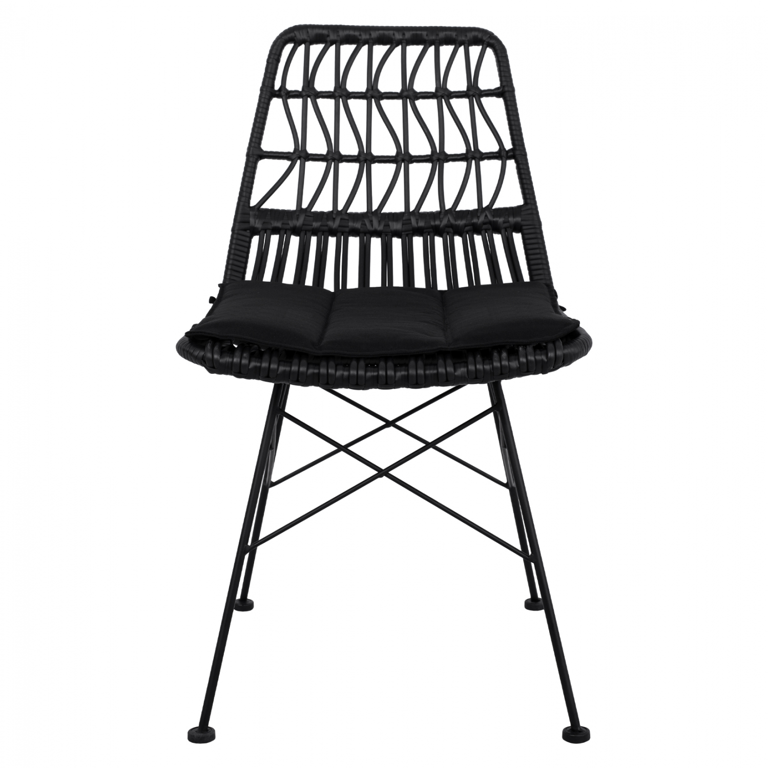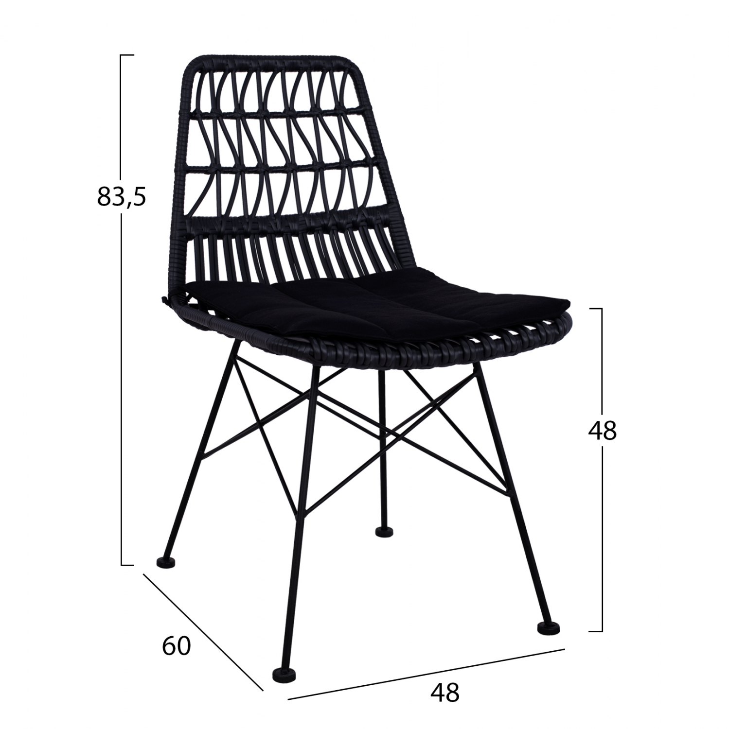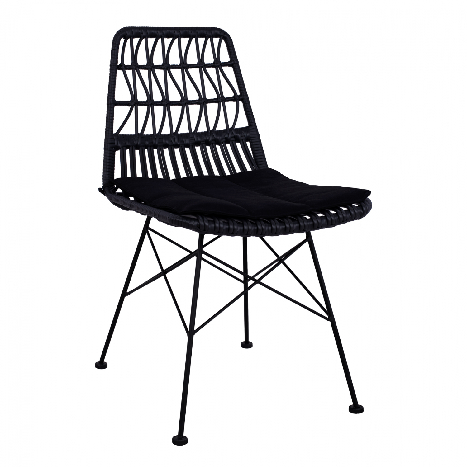 Μοντέρνα καρέκλα εξωτερικού, αλλά και εσωτερικού χώρου, κατασκευασμένη από μεταλλικό σκελετό και επενδυμένη με πλεκτό wicker σε μαύρη απόχρωση.