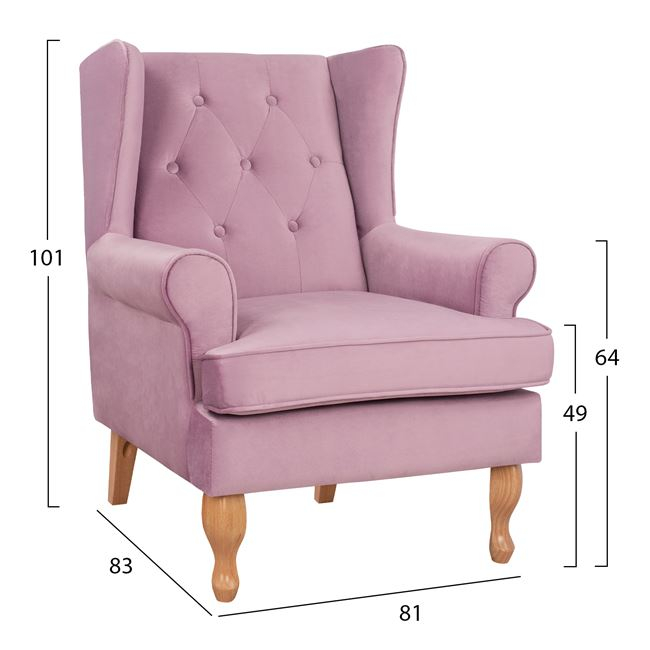 Πολυθρόνα μπερζέρα BRANDON σε λιλά απόχρωση με ενισχυμένο ξύλινο σκελετό στο εσωτερικό της και στα πόδια,