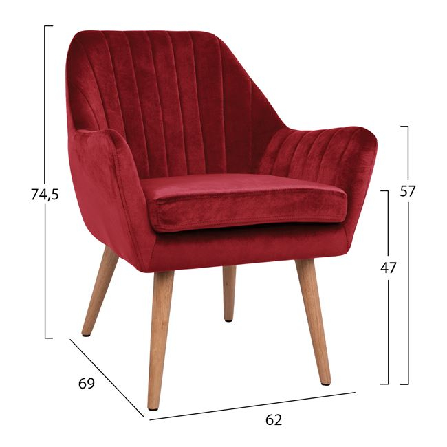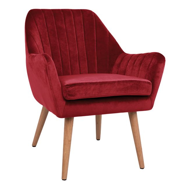 Πολυθρόνα CORENA με ύφασμα βελούδο σε κόκκινη απόχρωση και ξύλινα πόδια σε φυσική απόχρωση.