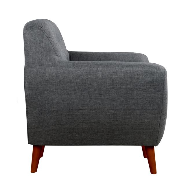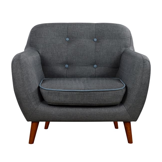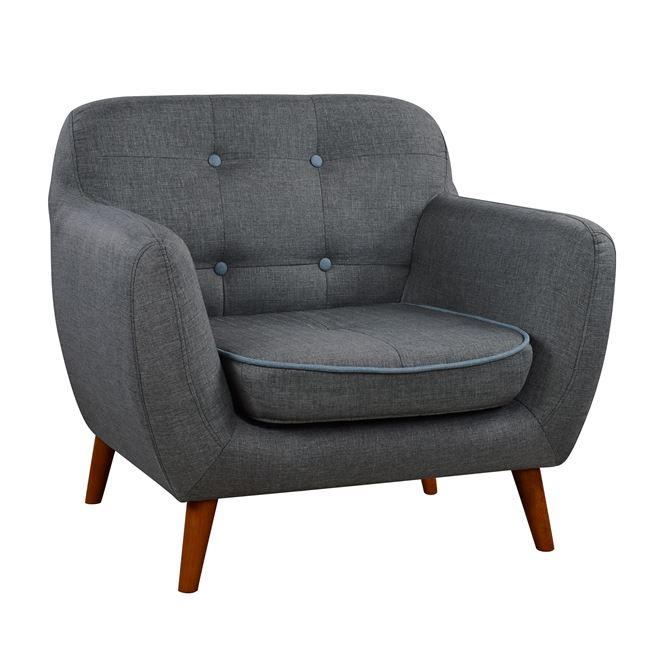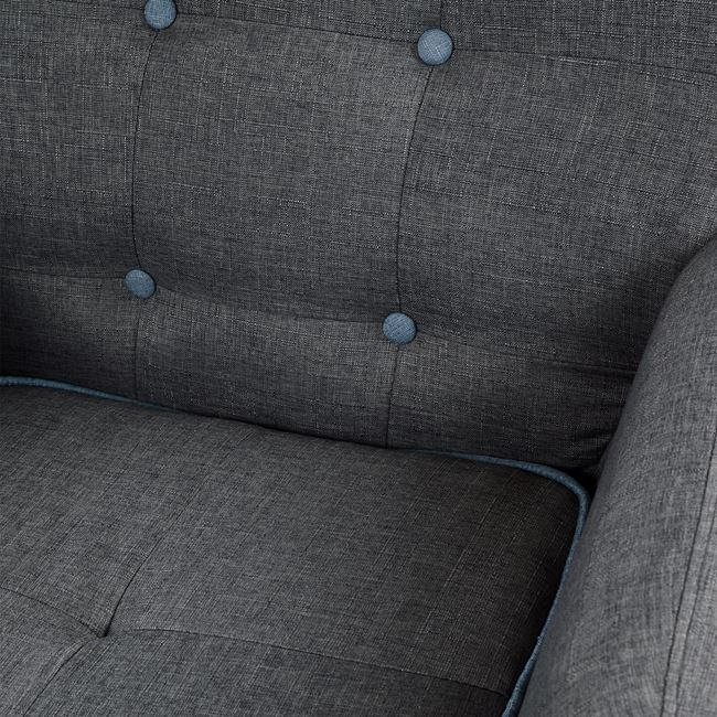 Κατασκευασμένη από ξύλινο σκελετό, επενδυμένη από γκρι ύφασμα και διακοσμημένη με κουμπιά στην πλάτη.