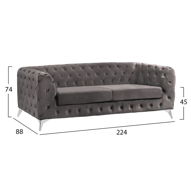 Τριθέσιος καναπές ALBERT με ύφασμα από βελούδο σε γκρι απόχρωση και μεταλλικά πόδια.