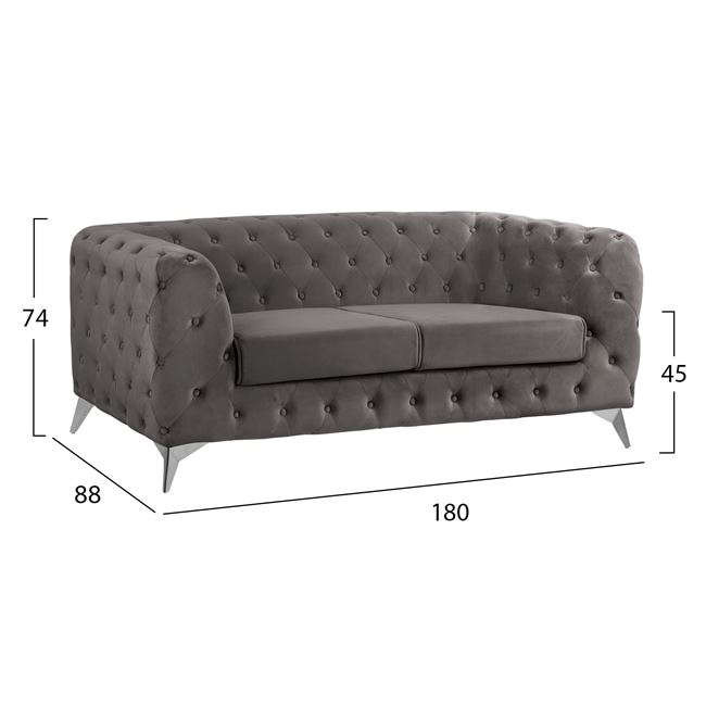 Διθέσιος καναπές ALBERT με ύφασμα από βελούδο σε γκρι απόχρωση και μεταλλικά πόδια.
