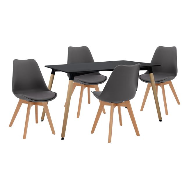 Τέσσερις καρέκλες με ξύλινα πόδια και πολυπροπυλένιο με δερμάτινο PU μαξιλαράκι σε σκούρο γκρι χρώμα. Τα πόδια της καρέκλας είναι απο μασίφ ξύλο.