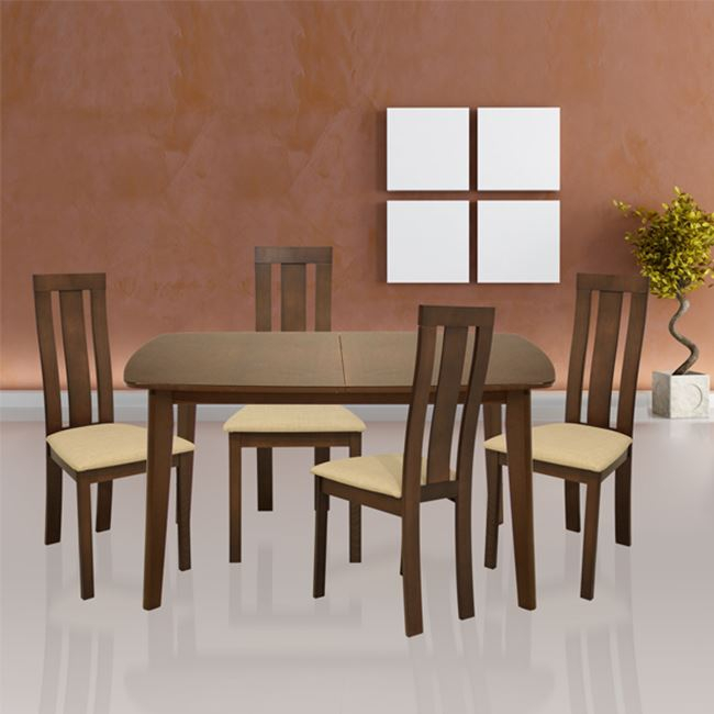 Το τραπέζι είναι κατασκευασμένο από μασίφ σκελετό,mdf επιφάνεια σε καρυδί χρώμα και διαθέτει επέκταση 30 πόντους.