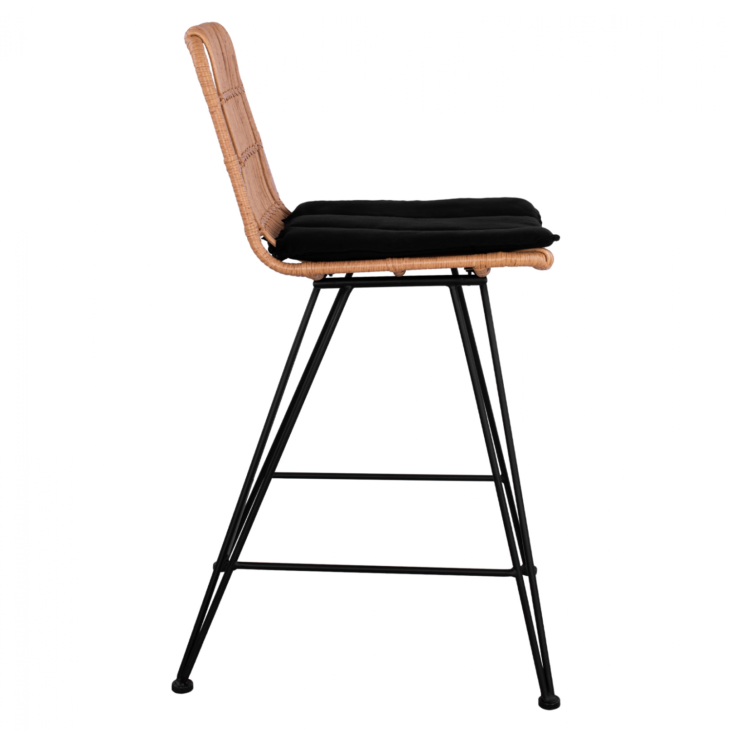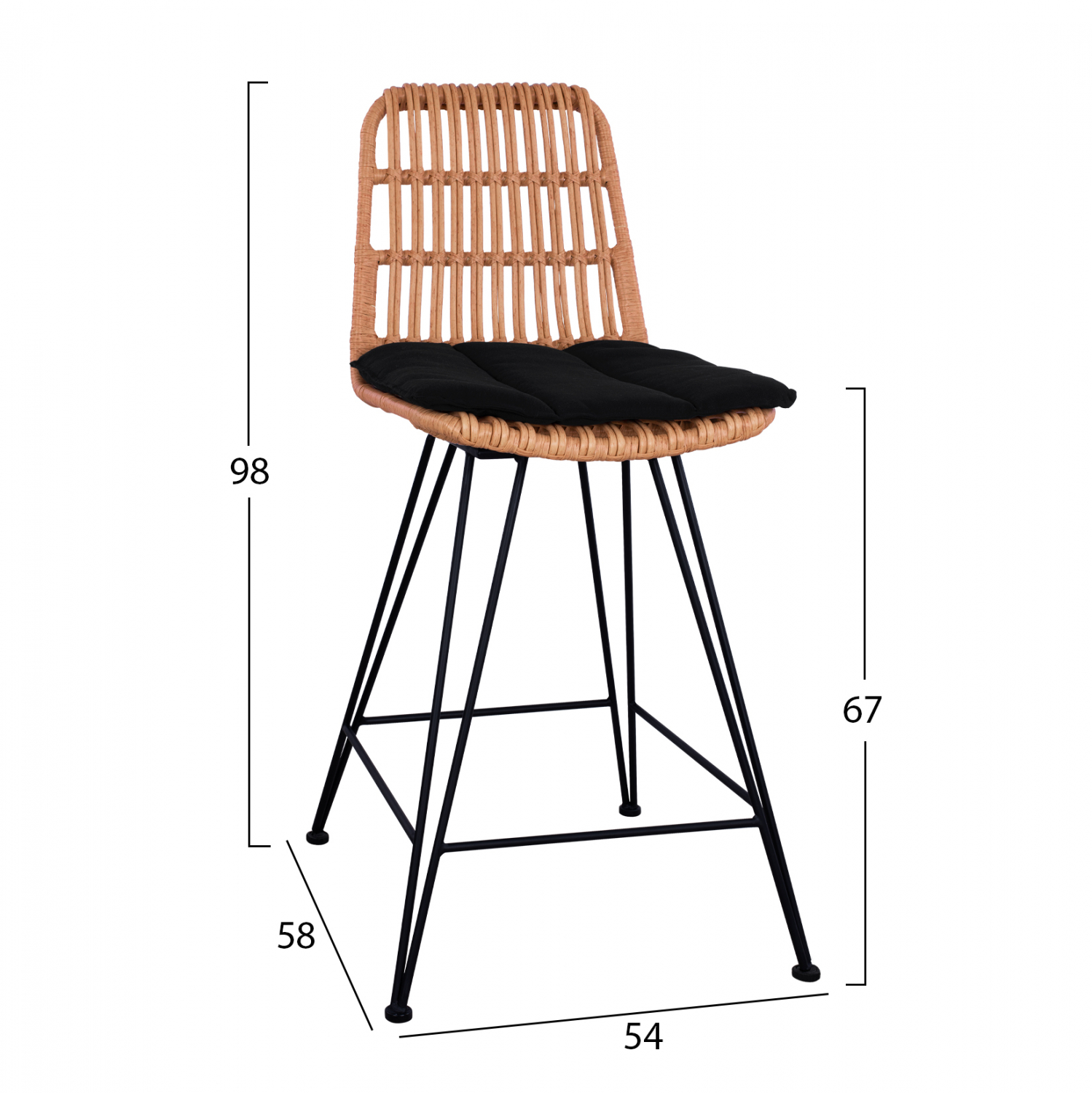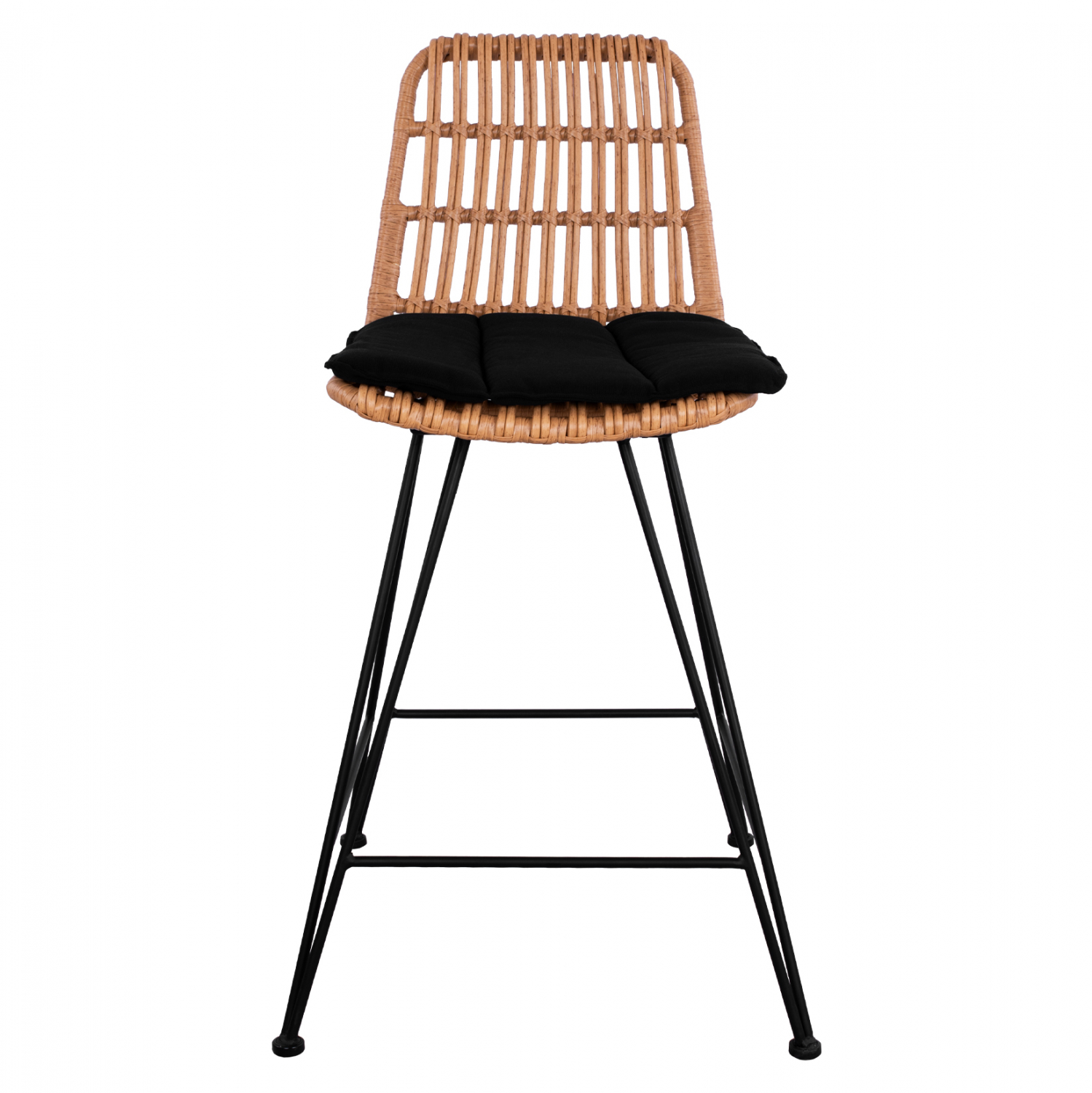 Μοντέρνο σκαμπό μεσαίου ύψους εξωτερικού, αλλά και εσωτερικού χώρου, κατασκευασμένο από μεταλλικό σκελετό σε μαύρη απόχρωση και πόδια από μασίφ σίδερο και επενδυμένο με πλεκτό wicker σε μπεζ απόχρωση.