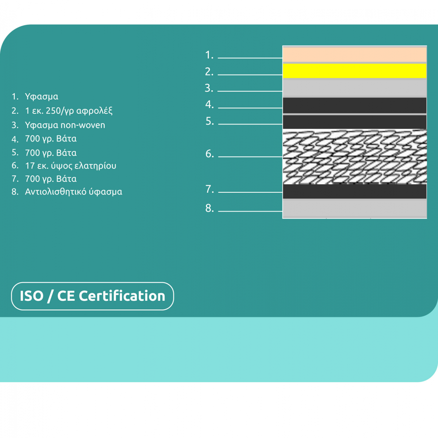 Είναι κατασκευασμένο με αφρώδες υλικό τύπου soft, έχει επίστρωση βάτας και υποαλλεργικό ύφασμα.
